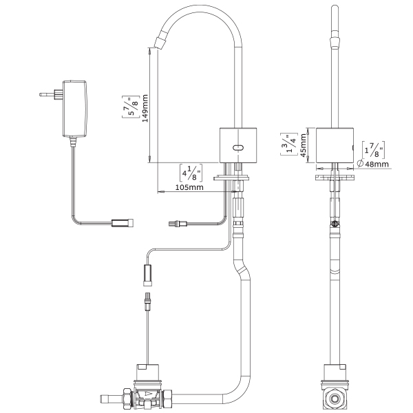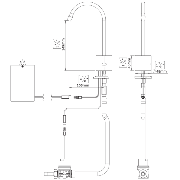 Touch free electronic glass or bottle filler commercial tap. Activated by IR sensor. For cold or premixed water. Available with Battery Box for 6 x 1.5V AA batteries or a 9V transformer. Filter included. Lead free waterways. Retrofit installation compatibility.