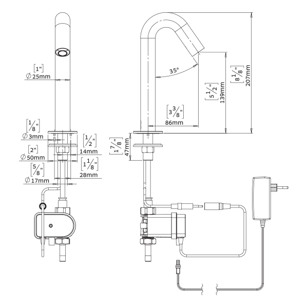 Touch-free deck-mounted electronic commercial tap. For cold or premixed water. Powered by IP67 Dual power input box connected with power splitter to 12V transformer. Integrated back up system to be used with 9V lithium battery enabling the faucet to be used normally in case of power failure. Chrome plated body, other finishes available. Activated by concealed sensor built into the spout. Filter included. Sensor includes a low battery indicator. Adjustable settings by remote control: sensor range, security time, delay in, delay out, on-off and reset to factory settings.