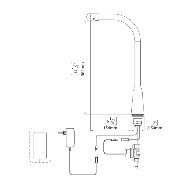 Touch free electronic commercial tap for deck mounted installations with goosneck spout. For cold or premixed water. Filter included. Activated by an infrared sensor. Includes a low battery indicator. Solid brass one-piece construction. Sensor range is adjustable manually and by remote control.