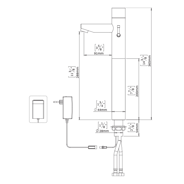 Touch-operated self-closing electronic lavatory commercial tap. For hot and cold water, includes a mixer for water temperature adjustment. Tall version for counter top washbasins. Long spout version. Filters included. The faucet will automatically shut off after a factory set flow time of 8 seconds. Flow time is adjustable on site. Latching solenoid valve is located above deck inside the product for added vandal protection.